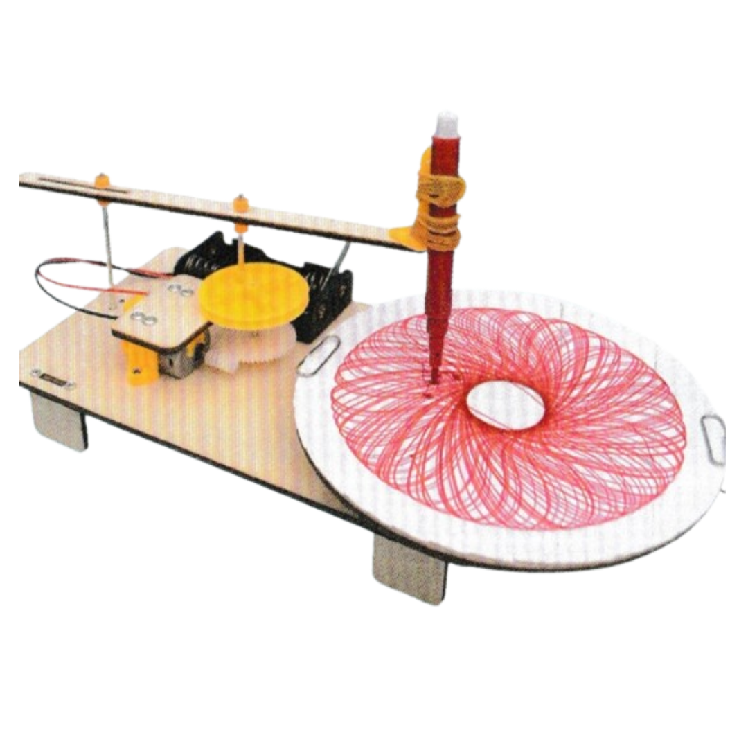 Introducing the Auto Plotter! It's a fascinating tool that uses math and physics to create beautiful designs. With its colorful gears, it can make over a hundred different flower shapes, each spinning just right according to the rules of math and physics. Kids will enjoy seeing the patterns it creates, while parents will appreciate how it teaches important concepts in a fun and engaging way!